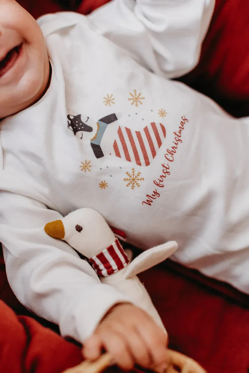 This little playmate will fit anywhere and will not leave your baby's side due to its handy size. The cute little goose is perfect as a first toy and is also a lovely birth gift. Its small size and light weight mean it can be easily grasped by baby hands. Inside there is a rattle that makes gentle noises and stimulates your baby's hearing. Made from 100% organic cotton, it is gentle on delicate baby skin and environmentally friendly. This little playmate will quickly become your baby's favorite toy and brings joy and comfort to everyday life.