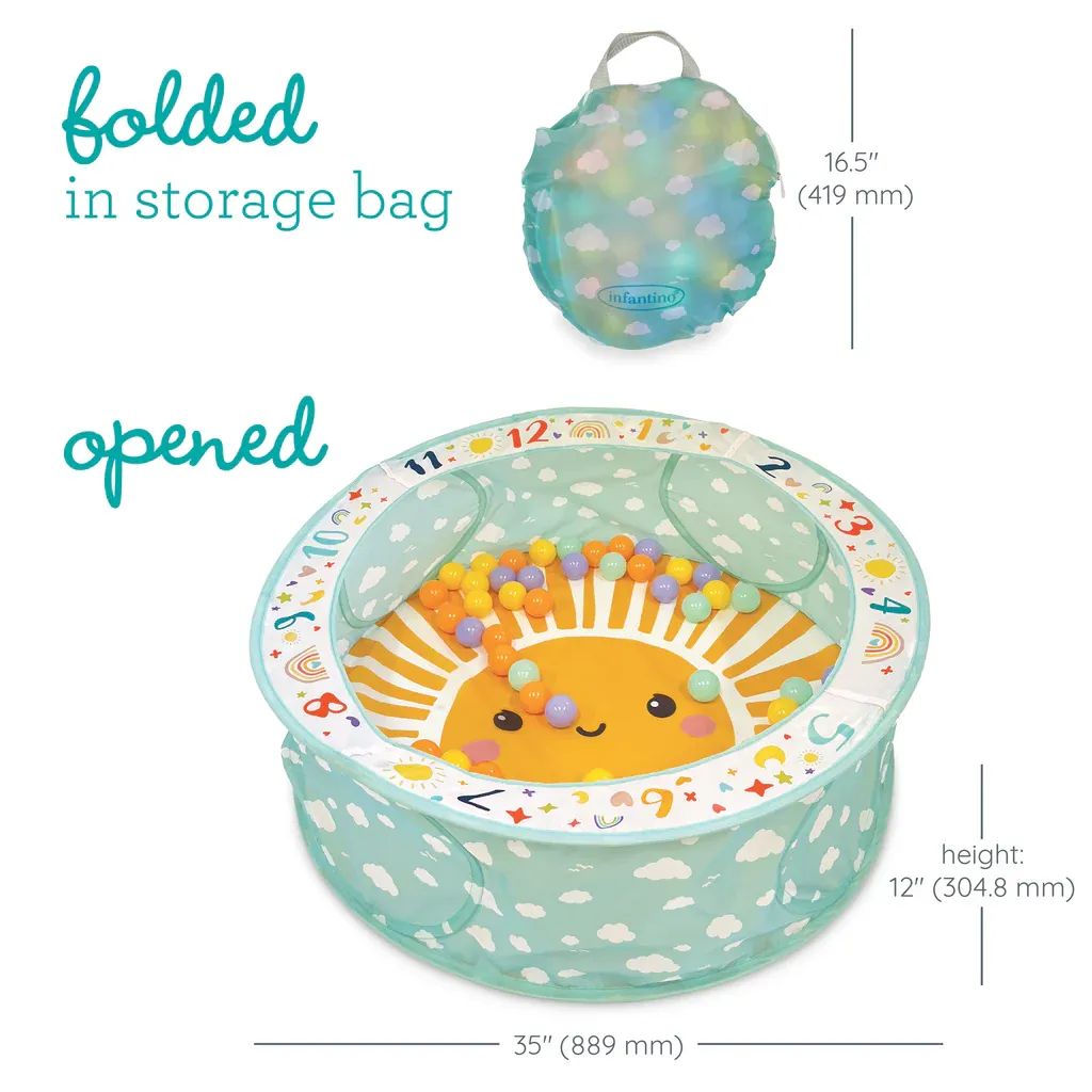Introducing the ultimate fun zone for your little explorer - our spacious 35" pop-up ball pit, complete with 50 vibrant, colorful balls. Designed for easy setup, it folds and unfolds in seconds, making it the perfect companion for both indoor playtimes and outdoor adventures. The included storage bag ensures hassle-free travel, so your child's favorite play area can come along on trips, ensuring entertainment wherever you go. With its bright, cheerful design, this ball pit is not just a source of lots of fun but also encourages motor skills development in a playful environment. The Infantino Pop-up Ball Pit is a must-have for any active child!
