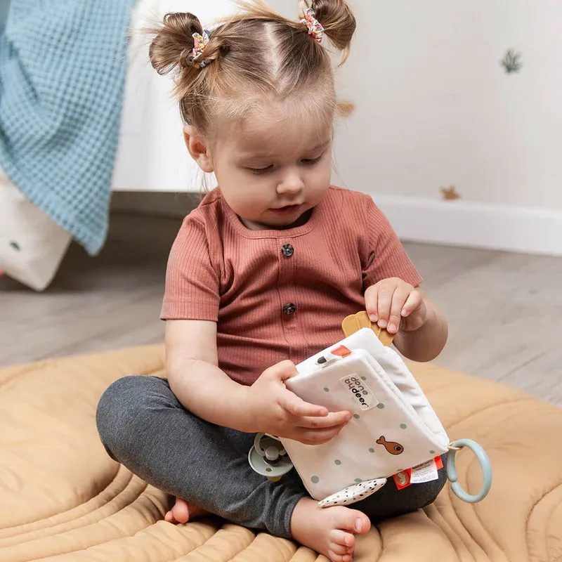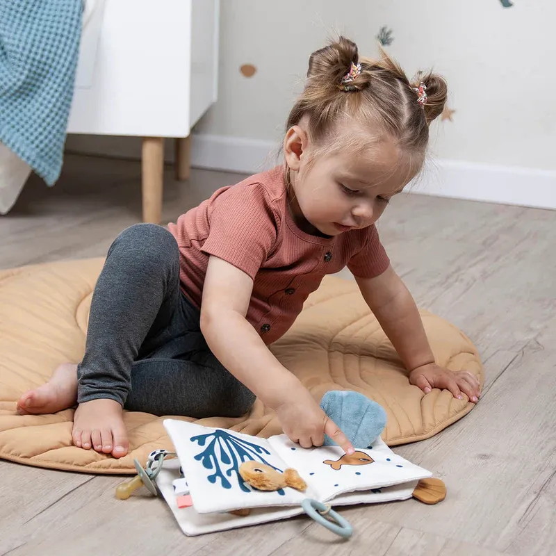 Use the toy link to attach the baby toy to a play mat for tummy time or a car seat for on the go entertainment. The soft activity book is a light beige with a playful mix of blue, powder and mustard coloured Sea creatures and ocean inspired elements.
