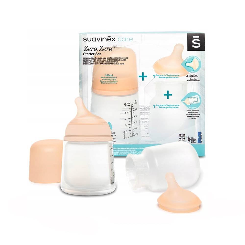 This pack includes 1 ZERO.ZERO 180 ml feeding bottle, an extra silicone pouch and a spare special breastfeeding teat (A).