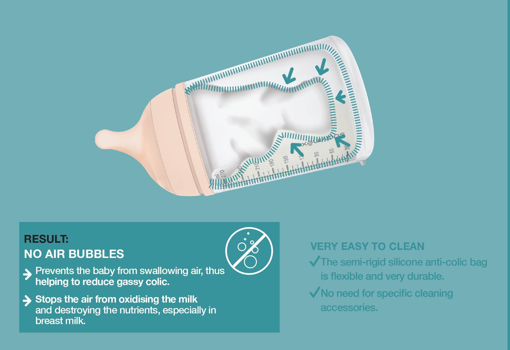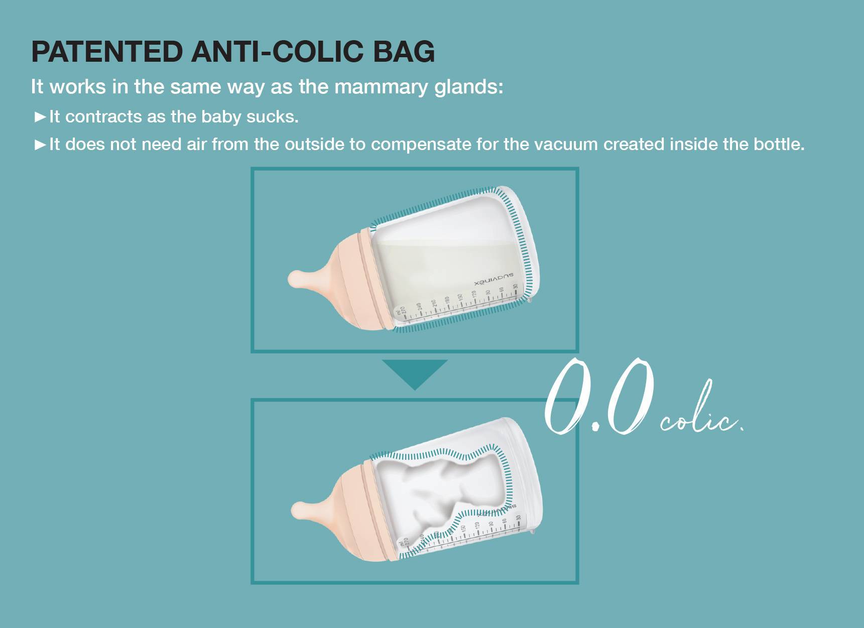 The patented anti-colic bag inside the bottle contracts as the baby sucks, just like the mammary glands. This protects babies from swallowing air, which can cause painful colic. It also prevents the air from oxidising the milk