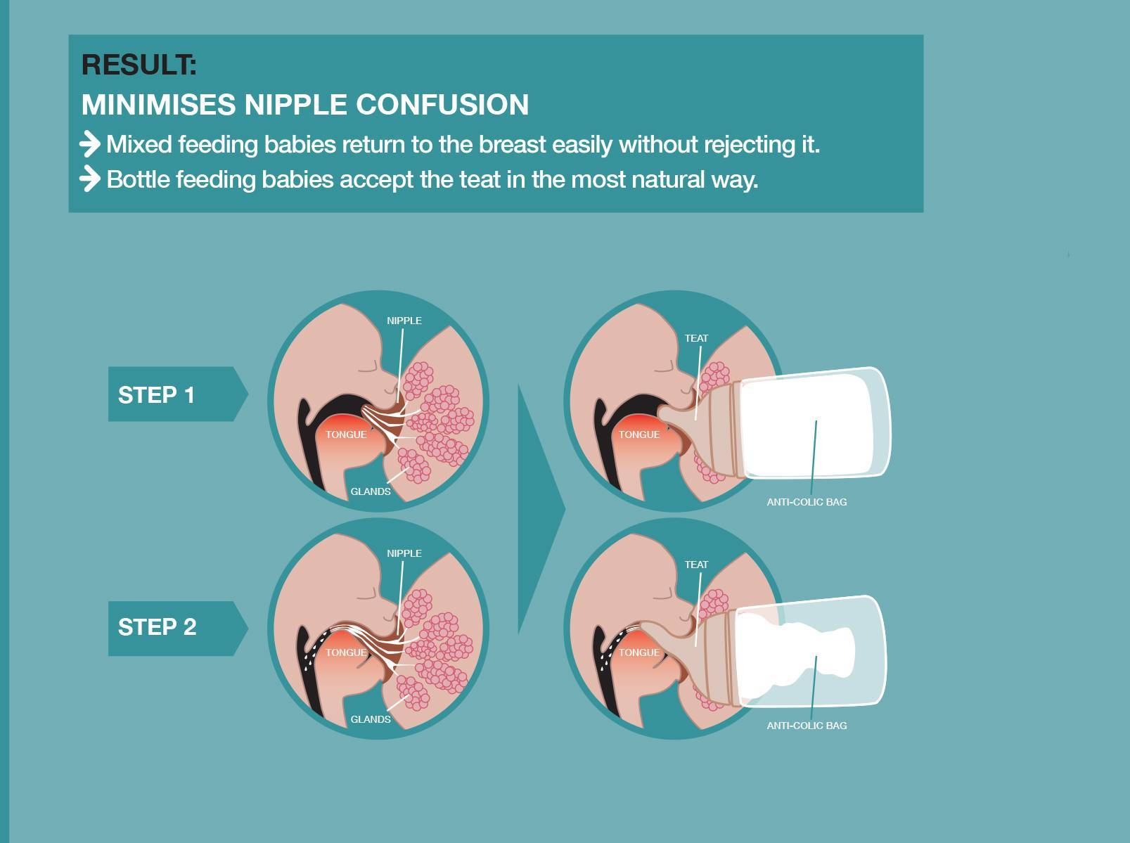 The zero.zero bottle teat mimics the shape, length and feel of the mother’s nipple, so there is no confusion. This
