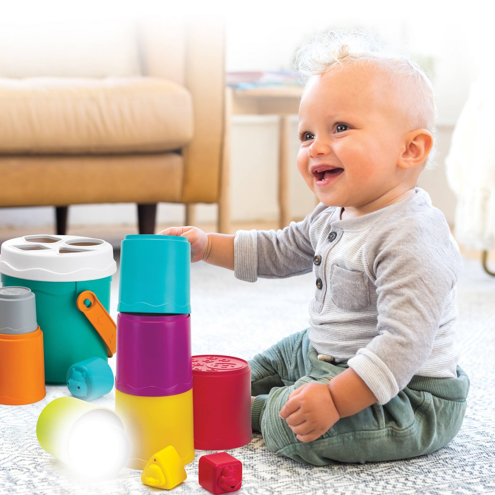 Includes 5 lightweight easy to stack multi-textured rings for early exploration. Bright, high contrast colors encourage visual development BPA free.8 stacking cups, 1 large bucket with handle and 1 shape sorter with 4 friendly-shape faces Encourages fine motor skills for little hands Great for playtime anywhere and on-the-go.