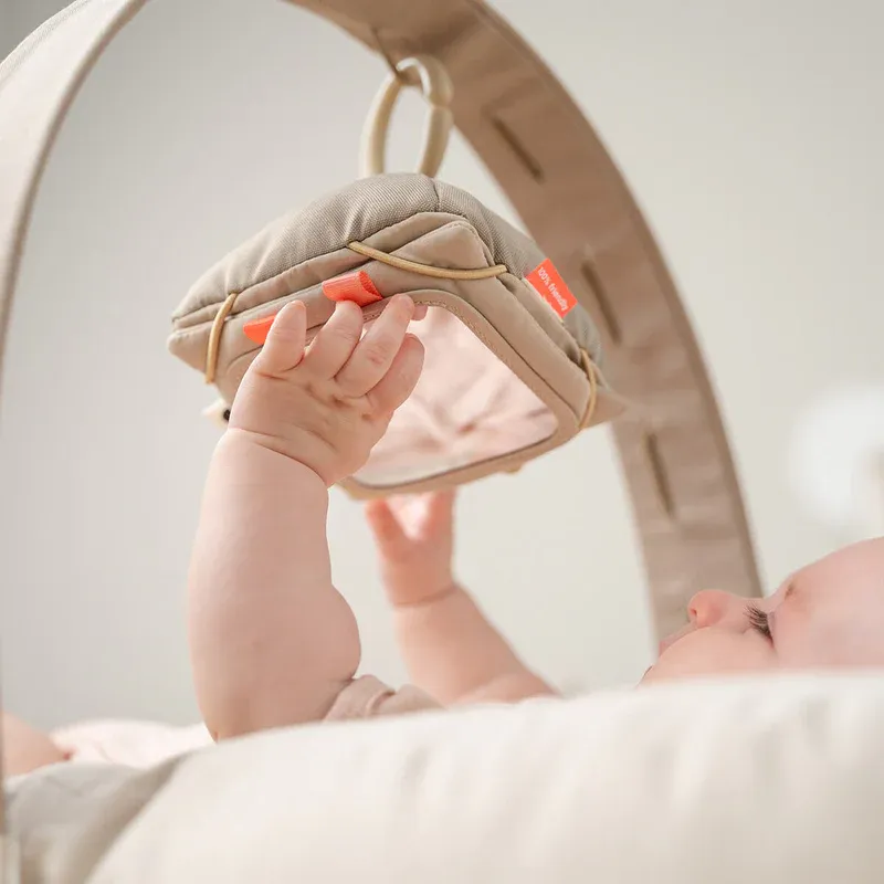 Our baby contrast card holder introduces your baby to visual exploration. The card holder is suitable from birth, fostering newborns' sight development. This customizable frame allows personalisation by adding your own picture or drawing. Included features, like a mirror and two double-sided cardboard cards, provide varied visual stimulation.